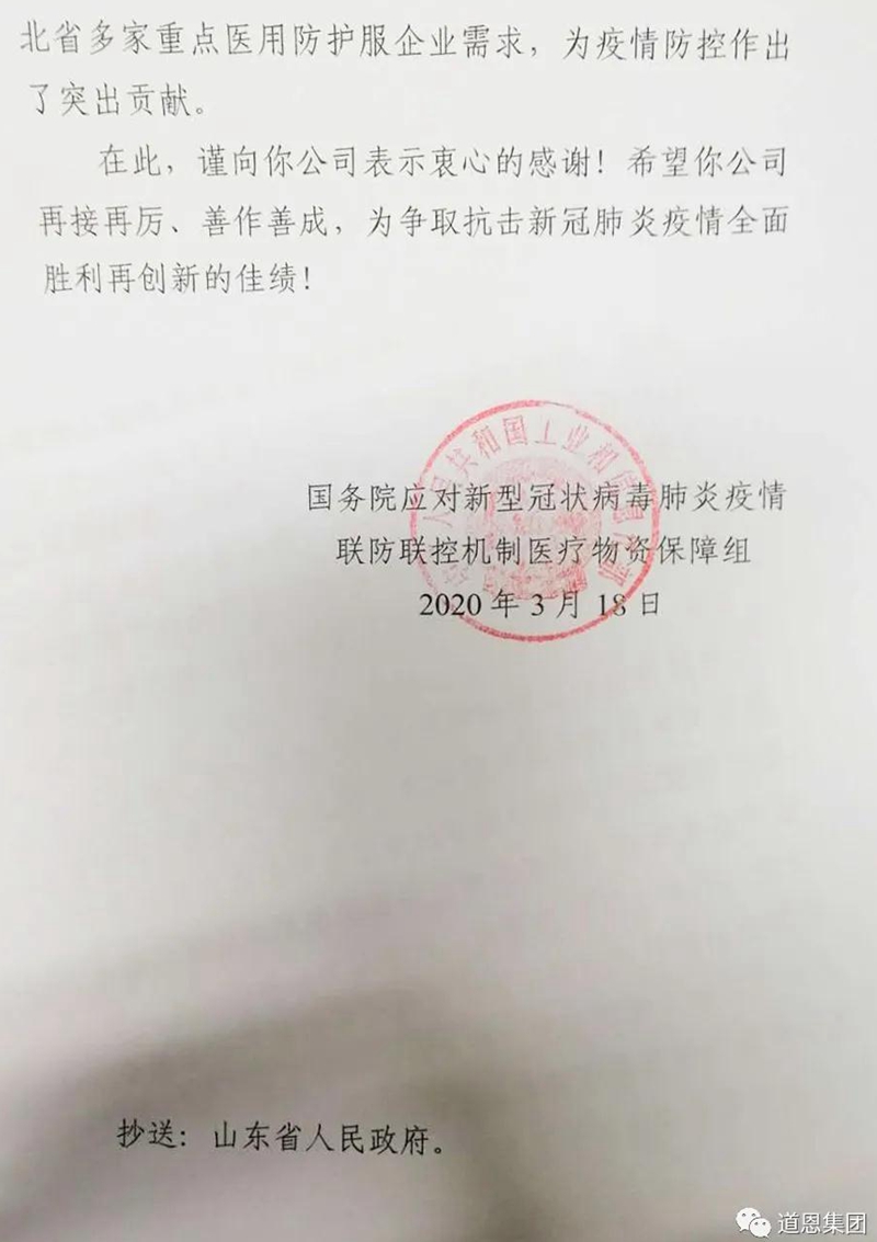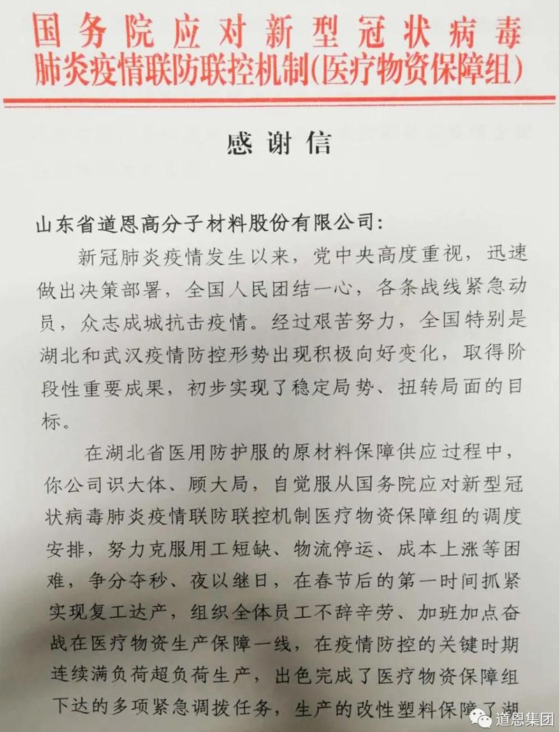 “你公司識大體、顧大局,自覺服從國務(wù)院應(yīng)對新型冠狀病毒肺炎疫情聯(lián)防聯(lián)控機(jī)制醫(yī)療物資保障組的調(diào)度安排,組織全體員工不辭辛勞,加班加點奮戰(zhàn)在醫(yī)療物資生產(chǎn)保障一線,為疫情防控作出了突出貢獻(xiàn)。”3月18日,國務(wù)院應(yīng)對新冠肺炎疫情聯(lián)防聯(lián)控機(jī)制醫(yī)療物資保障組給道恩股份發(fā)來一封感謝信,對道恩人在疫情期間所作的貢獻(xiàn)表示感謝,并鼓勵企業(yè)再接再厲,再創(chuàng)佳績。