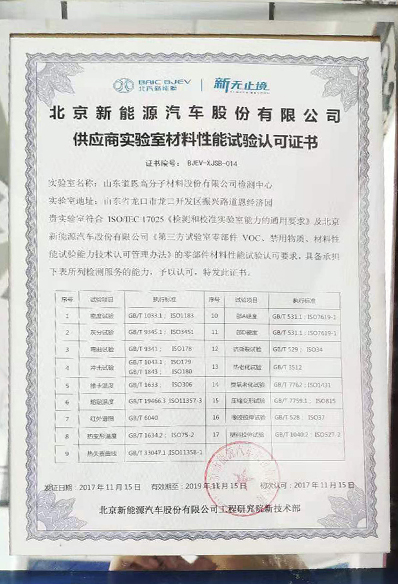 北京新能源汽車股份有限公司供應商實驗室材料性能試驗認可證書