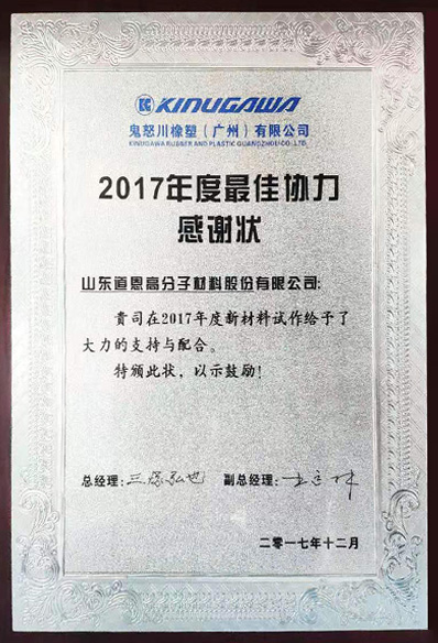 鬼怒川橡塑(廣州)2017年度最佳協力感謝狀