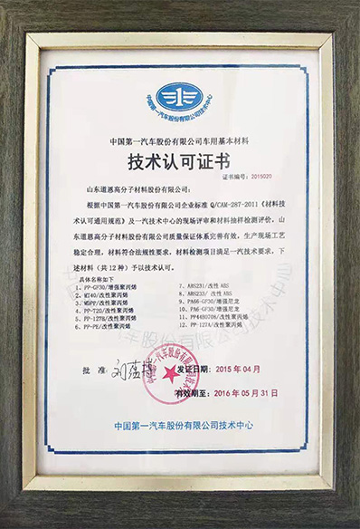 中國第一汽車股份有限公司車用基本材料技術認可證書