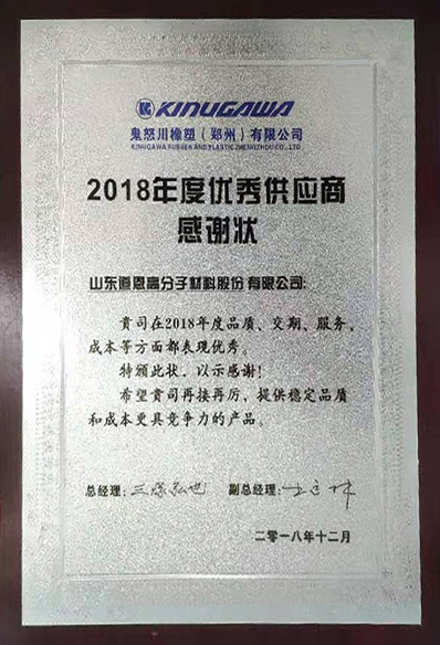鬼怒川橡塑(鄭州)2018年度優秀供應商感謝狀